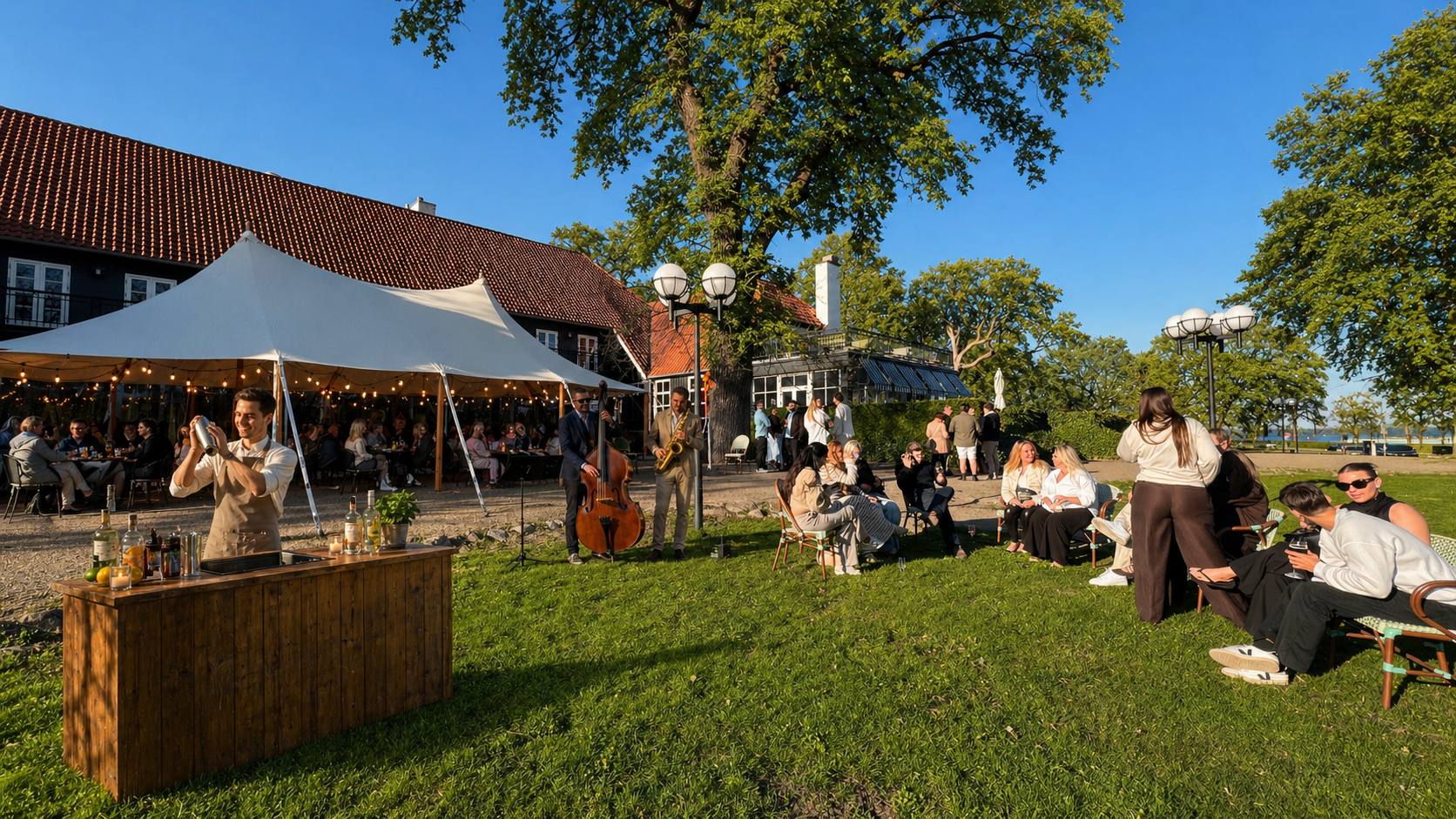 Alle er velkomne til vores live musik på terrassen i Charlottenlund, men vil du være sikker på en plads i sommerteltet, anbefaler vi, at du booker bord og vælger grillmenuen.